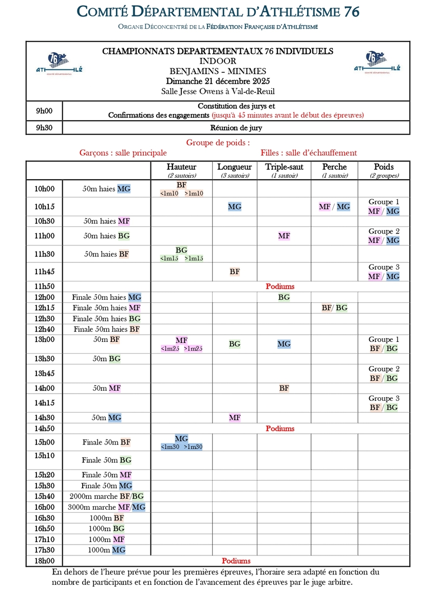 Résultats des départementaux benjamins et minimes individuels en salle du 21 décembre 2025