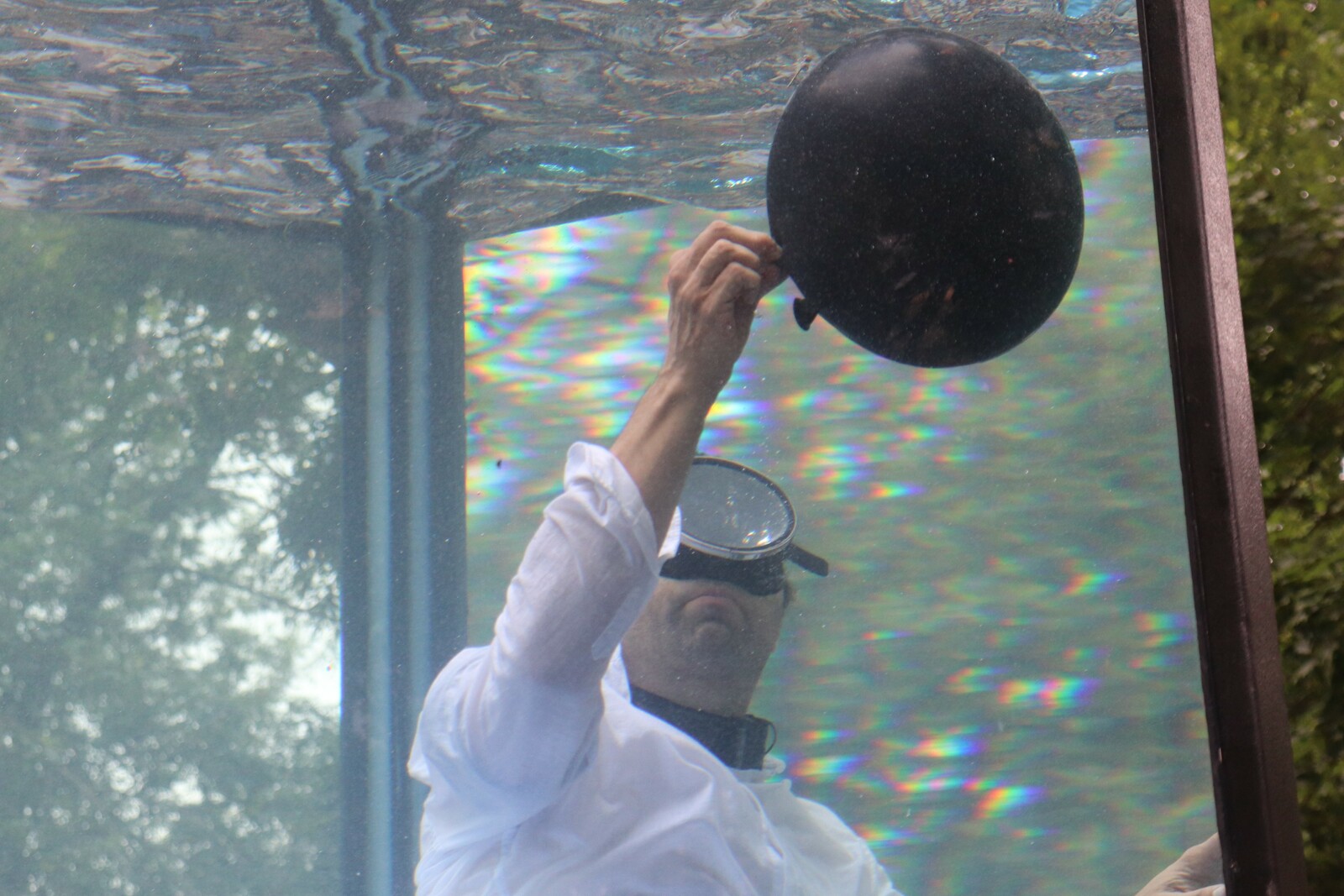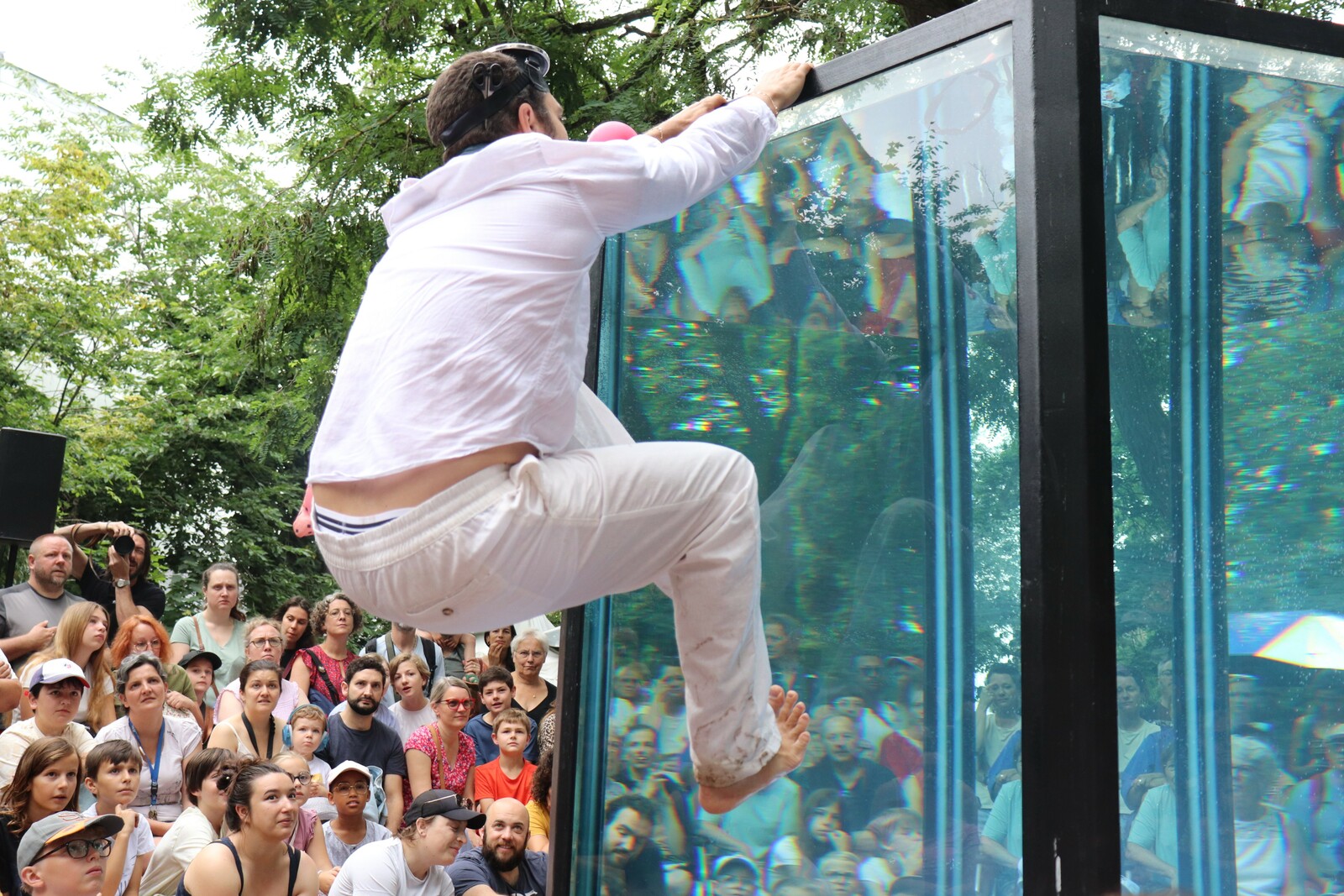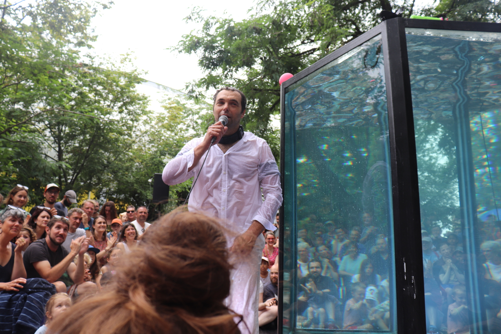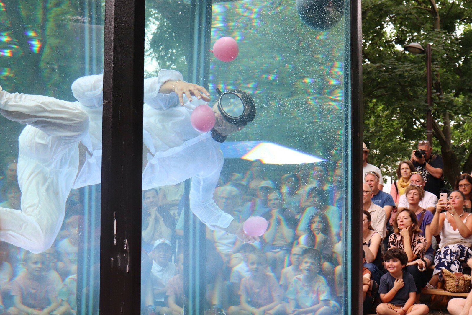 C'est un jongleur dans une piscine qui fabrique plusieurs objets, Il nage et tourne dans son aquarium tout en jonglant. Il y a sept objets qui peuvent couler ou flotter en fonction de leur poids. C'était très drôle, j'ai beaucoup aimé le moment ou il gonflait un ballon en forme de chien avec de l'eau et le moment ou il racontait sa journée à la fin du spectacle.