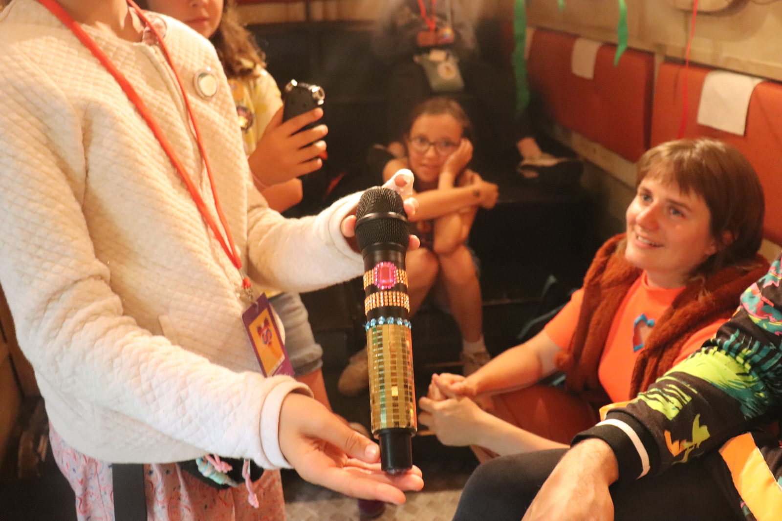 R : Il y a des certaines choses qui n'y a pas dans le livre. Il y a des personnages qui ont été adaptés. Et encore une fois, c'est avec les enfants des écoles qu'on a essayé de trouver qu'est-ce qu'ils parlaient le plus aux enfants. Parce que par exemple, dans le livre, il y a un grand couturier qui fait référence à Carla Garfield. Les enfants ne savaient pas qui c'était, du coup, nous on s'est dit, qu'on allait l'appelé Monsieur Mbap, les enfants, ils connaissent tous et ils aiment Mbapé. On trouvait que c'était marrant que ça fasse des références que les enfants y comprennent, et les adultes aussi. Pour le micro aussi, on s'est dit que les stars, surtout féminines comme Angèle ou Aya Nakamura, ont souvent des micros avec pleins de paillettes, ils valent souvent très cher, nous on a fait avec des autocollants, mais ça rend bien non ?