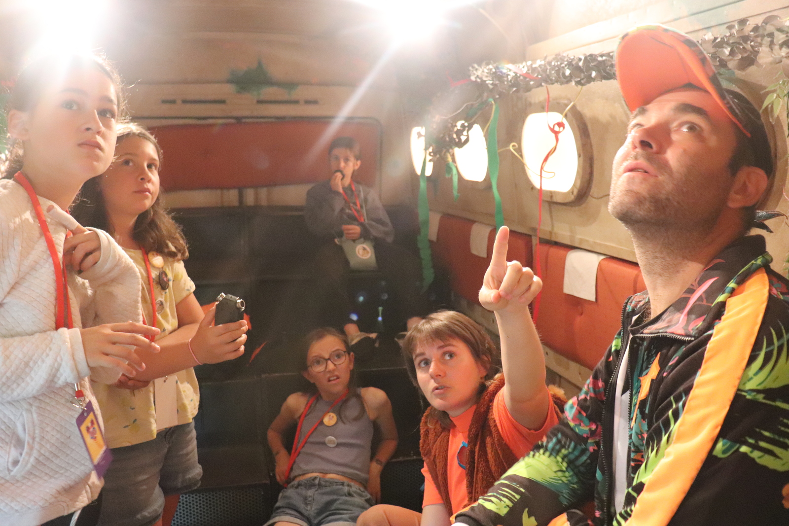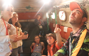 R : C'est une spécialité, on va dire, de la compagnie. Il y a d'autres gens qui font ça, mais la compagnie, la Méandre, ses premiers spectacles, c'était dans des caravanes. Du coup, on aimait bien l'idée que ce soit un peu cosy, que ça fasse un moment où on n'est pas nombreux. Et en plus de ça, on avait envie que ce soit immersif. Immersif, ça veut dire qu'il y a plein d'enceintes, plein de lumières qui sont dispersées partout et qui donnent l'impression, par exemple, que quand il y a de l'orage, des fois, il y a des enfants qui sortent et qui se demandent s'il n'y a pas vraiment eu de l'orage. Du coup, c'est ça l'idée, c'est de vraiment faire comme si on était dans la jungle, au milieu de la jungle.