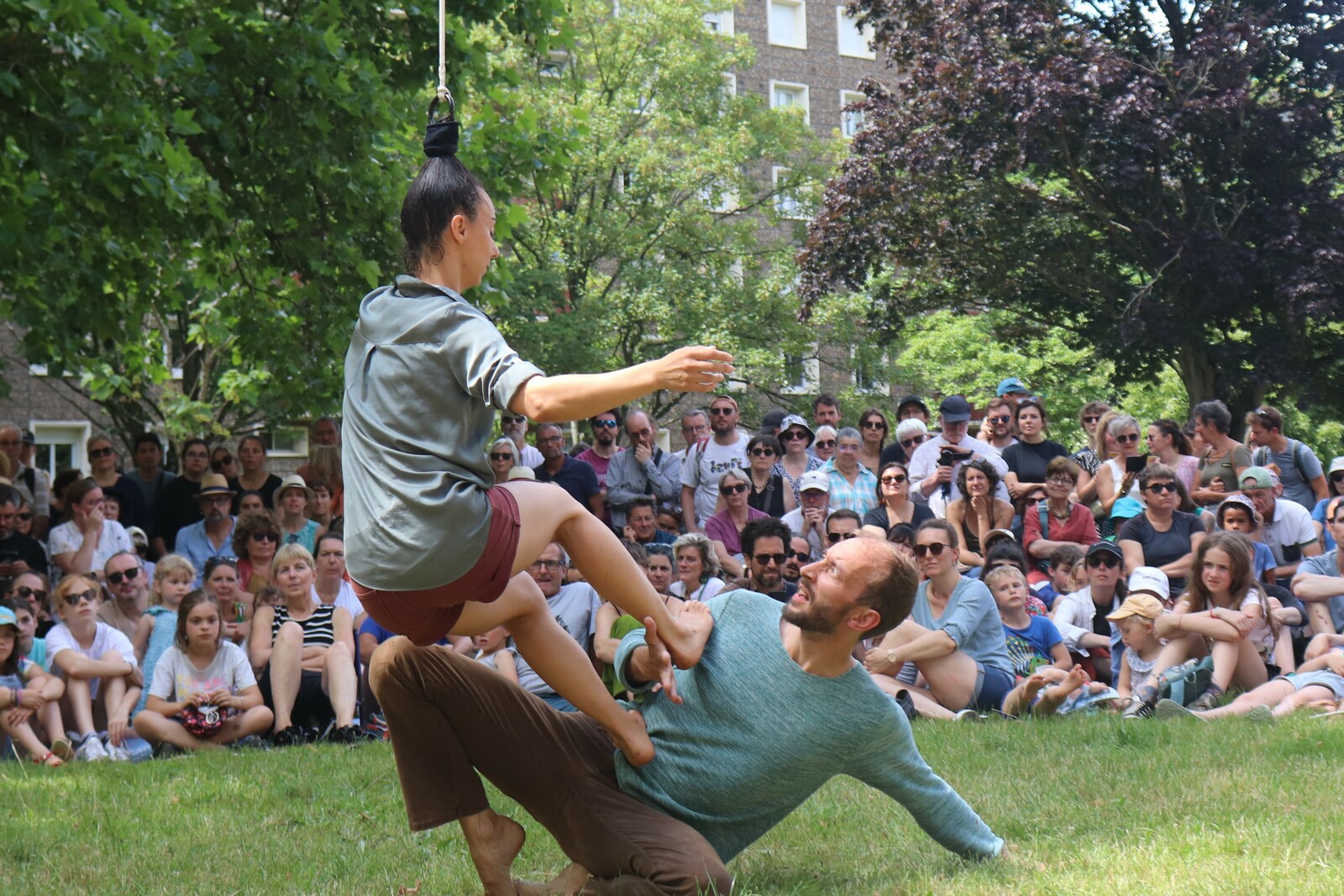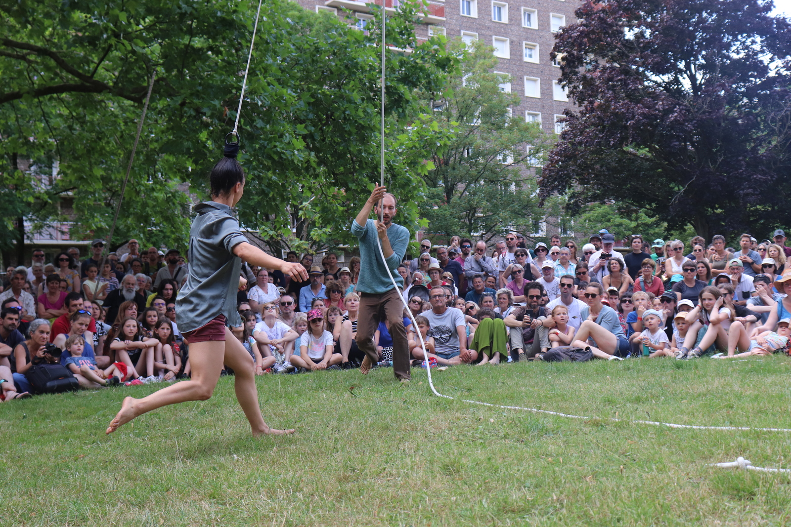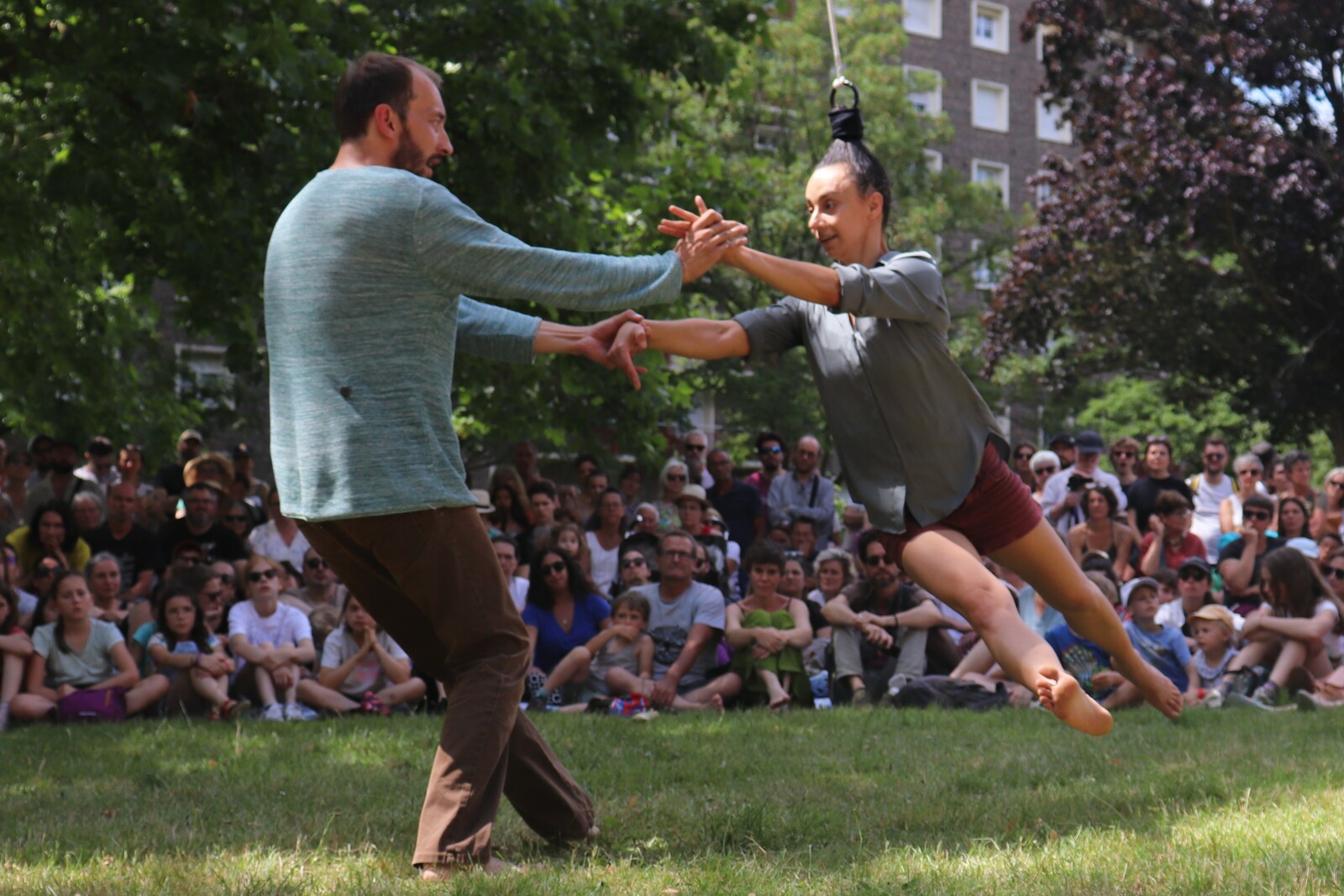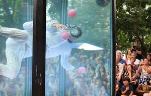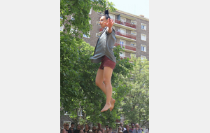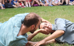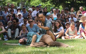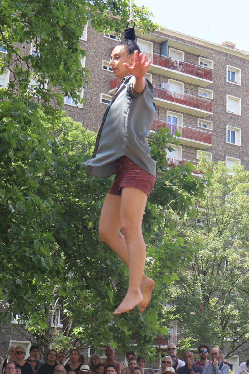 Un spectacle poétique et un peu acrobatique ou la femme est accrochée par les cheveux et est comme une marionnette. Par moment on aurait dit comme un combat d'arts martiaux. Très beau et en plus ça nous a changé car ce n'était pas dans le Bois de la Garenne mais dans la Zone Verte.