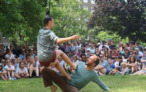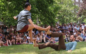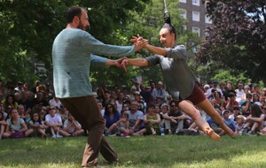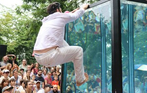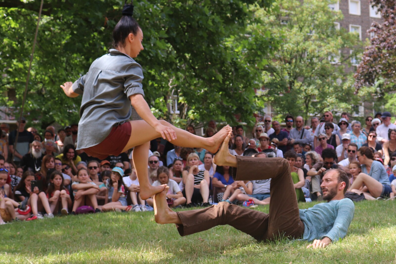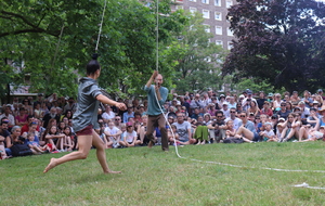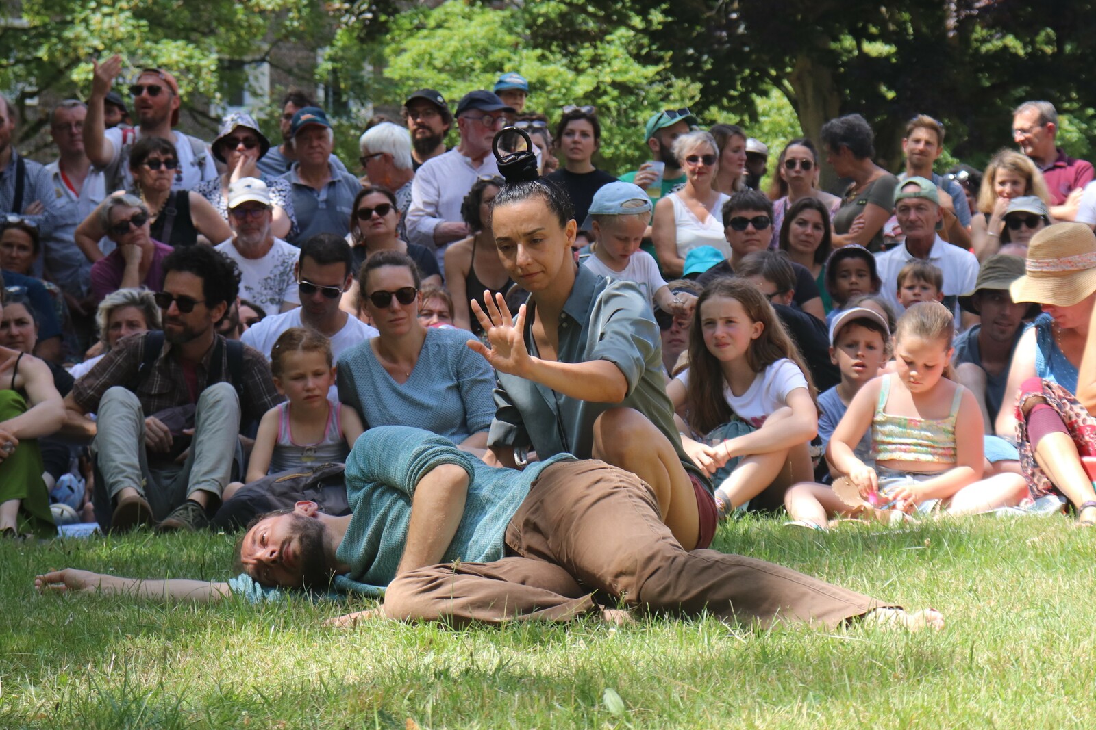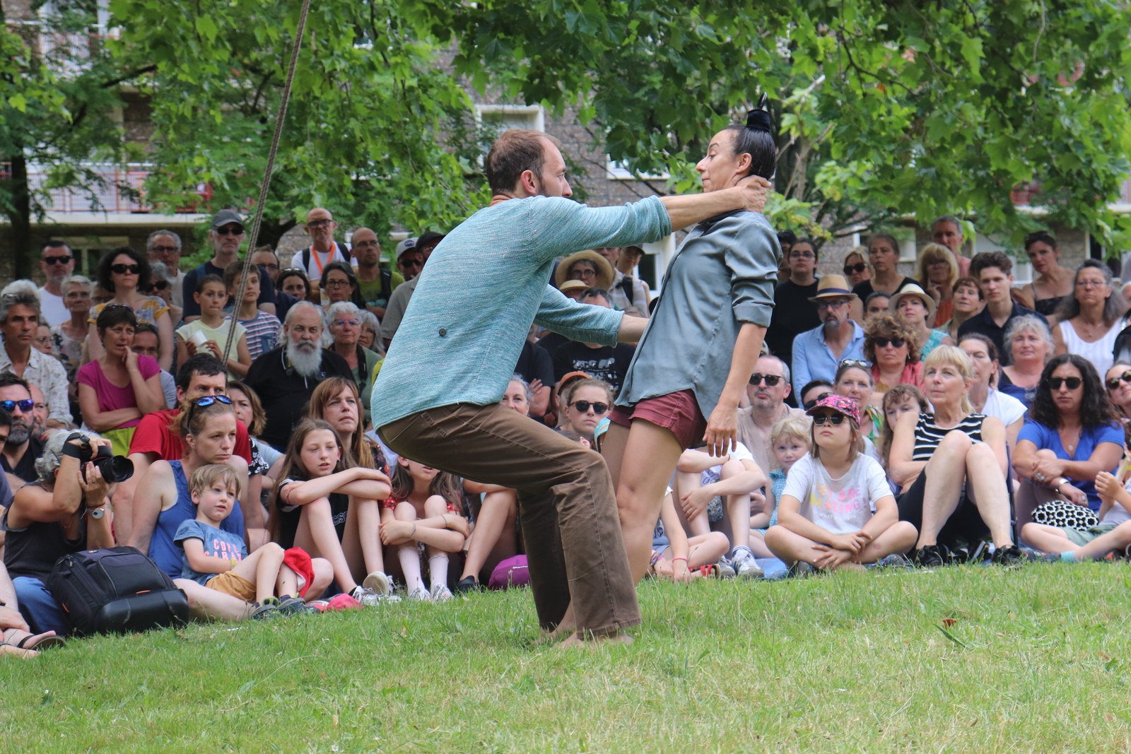 Un spectacle poétique et un peu acrobatique ou la femme est accrochée par les cheveux et est comme une marionnette. Par moment on aurait dit comme un combat d'arts martiaux. Très beau et en plus ça nous a changé car ce n'était pas dans le Bois de la Garenne mais dans la Zone Verte.